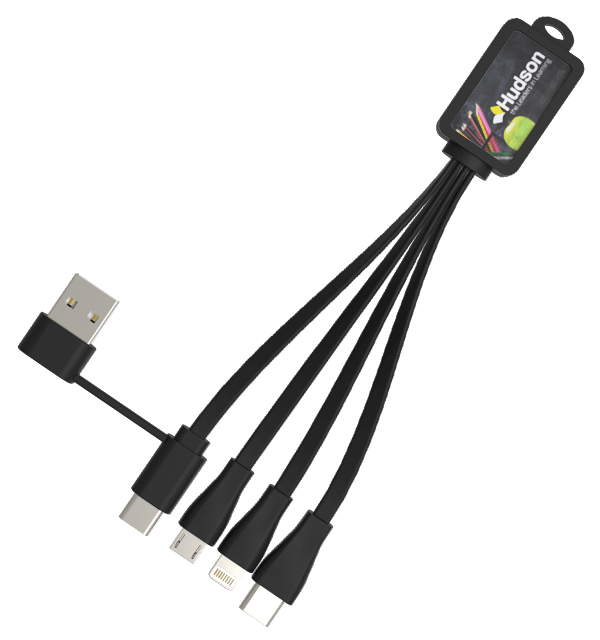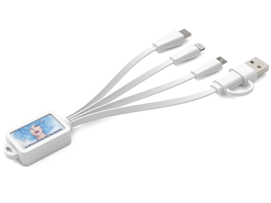 Multi yhdistää neljä kaapelia yhteen siistiin ja kätevään malliin. Asiakkaasi voivat liittää tavallisen USB-liitännän virtalähteeseen ja ladata jopa 3 laitetta Lightning-adapterin, USB-C-liittimen ja Micro-USB-liittimen kautta. Multin voi kiinnittää avaimiin ja sillä on kaunis pinta-ala, johon voidaan valokuvatulostaa kuva, logo, verkkosivuston osoite ja iskulauseenne. Jos haluat puisen kosketuksen, tutustu -malliin.