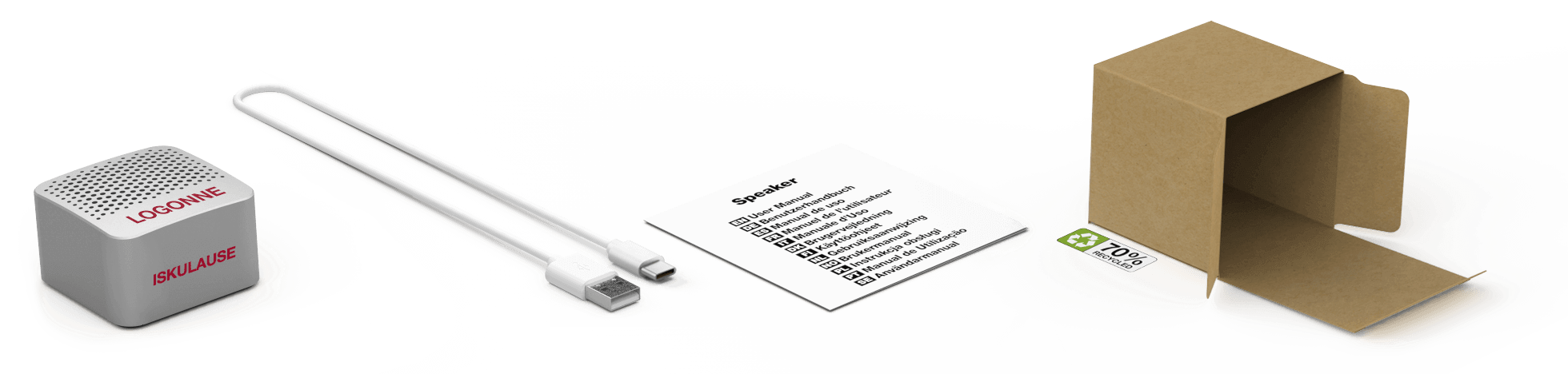 Käyttäjä näkee Bluetooth® nimen mobiililaitteensa tai tablettinsa näytöllä yrittäessään parittaa tätä Audio tuotteeseen. Voimme muokata tämän nimen brändinne nimeksi, antaen organisaatiollenne enemmän näkyvyyttä. Jos et halua tätä palvelua, oletusasetuksena tuotteen nimeksi tulee 'Promo Audio".Lisätarvikkeet