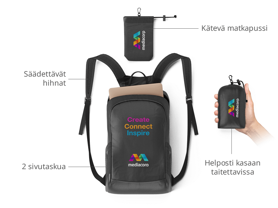 Trip-reppu on täydellinen yhdistelmä käytännöllisyyttä ja brändimahdollisuutta — ihanteellinen messuille, konferensseihin, sisäiseen markkinointiin ja paljon muuta! Reppumme ovat täysin räätälöitävissä yrityksesi logolla tai taideteoksella ammattimaisen Kuvatulostuspalvelumme ansiosta.