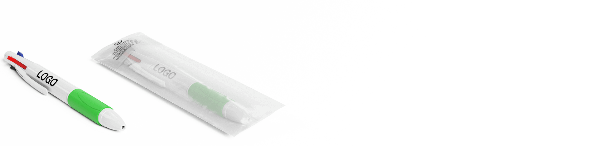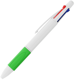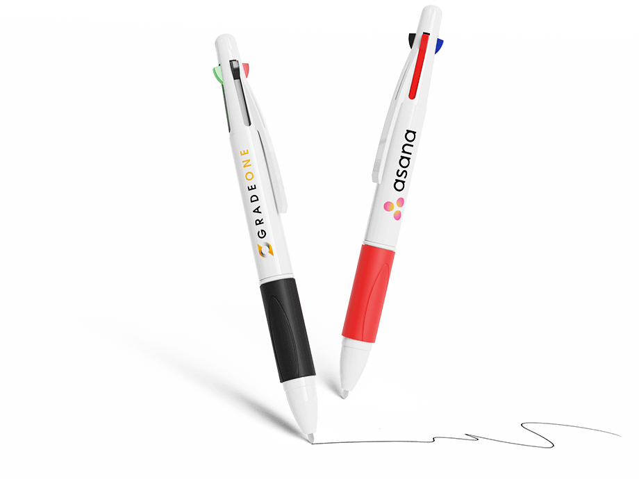 Quad on klassinen 4 värikynä, jossa on sininen, punainen, vihreä ja musta kuulakärki 1-mallissa. Jokainen värivaihtoehto paljastuu ja vetäytyy kynän yläosassa olevien napsautusliukusäätimien avulla. Mukava termoplastinen kumikahva on saatavana useissa väreissä täydentämään brändiäsi. Valkoiseen ulkokuoreen voidaan tulostaa valokuva, jossa on logosi, iskulauseesi ja paljon muuta.
