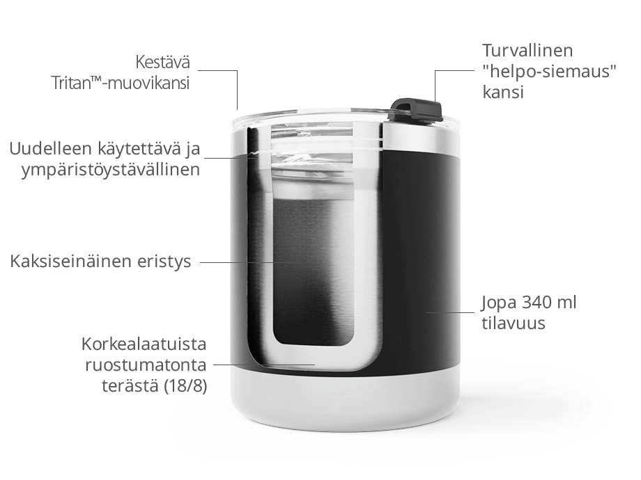 Sen lisäksi, että Crew on mainio mainoskäyttöön, se on yhtä lailla toimiva ja käytännöllinen sille, joka sen saa. Asiakkaat, asiakkaat, työntekijät ja muut organisaatiosi sidosryhmät haluavat todella käyttää tätä matkakuppia päivittäin!