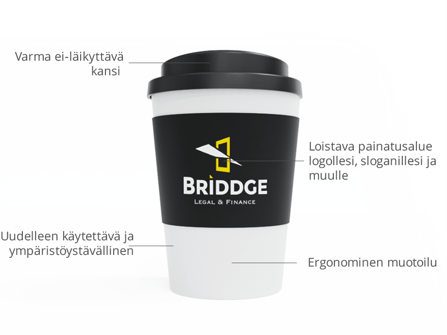 Silikonimukin hylsyn runsas brändipinta-ala pitää logosi etualalla. Tämä näkyvyys yhdistettynä tarkkaan ja elinvoimaiseen painatukseemme tekee muotoilustasi ohittamattoman ja todellisen kohokohdan. Voit myös valita kupin hihan värin 8 upeasta väristä, jotta se sopii yhteen yrityksesi värimaailman kanssa ja tekee logostasi näyttävän! Klassinen valkoinen runko ja musta kansi tarjoavat täydellisen taustan yksilöllisten brändäysvaihtoehtojen esittelylle.