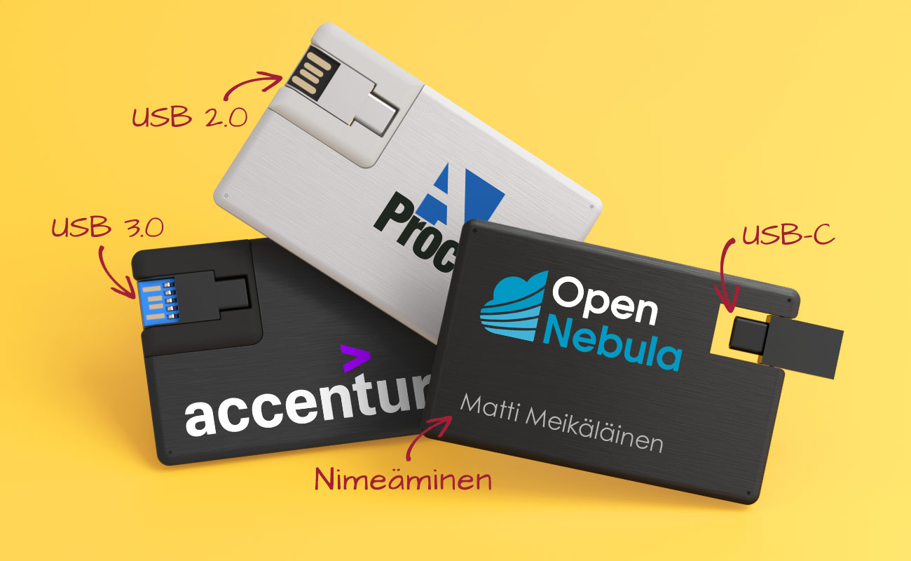 Voimme esiasentaa USB-muistitkuille ja -korteillemme esitelmiä, tuotekuvastoja tai mitä tahansa muuta haluamaasi markkinointimateriaalia. Lue lisää