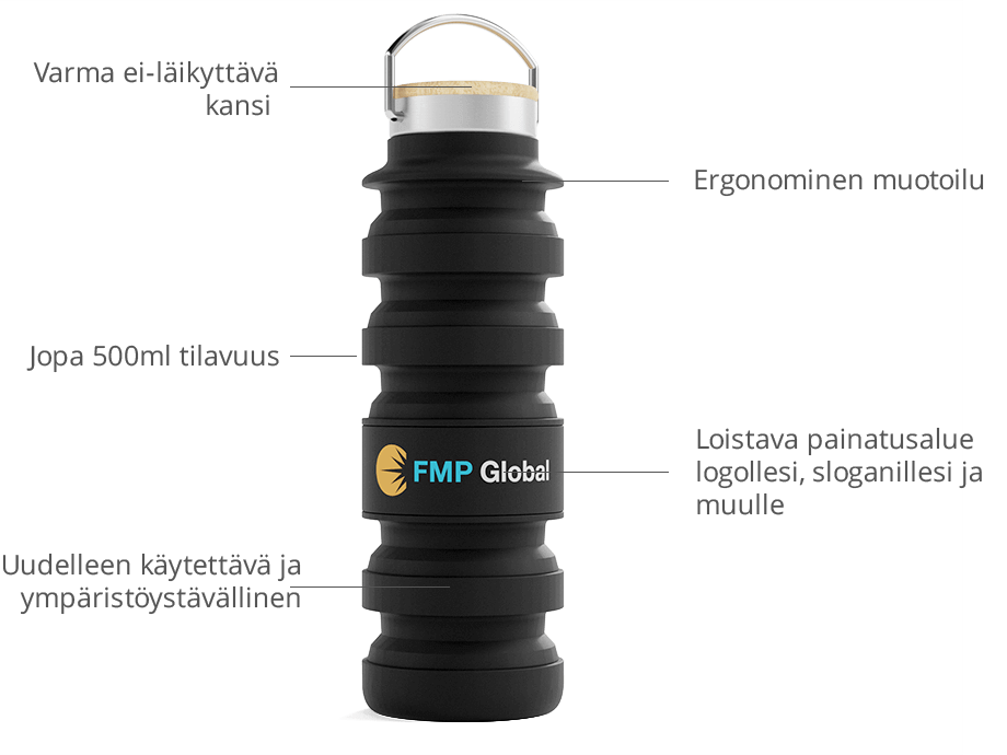 Esittelyssä Flexi kokoontaitettava vesipullo, täydellinen mainosmateriaali brändillesi! Tämä joustava juomapullo on jokapäiväisessä elämässä välttämätön esine, ja se pitää brändisi varmasti sekä potentiaalisten asiakkaiden että sidosryhmien mielessä. Voimme painaa BPA-vapaaseen pullon runkoon haluamasi logon tai iskulauseen silkkipainolla, valokuvapainolla tai laserkaiverruksella. Tuotemerkille varattu alue on ainutlaatuinen ja runsas, ja me näytämme kuvasi tarkasti korkearesoluutioisena ja eloisissa väreissä.