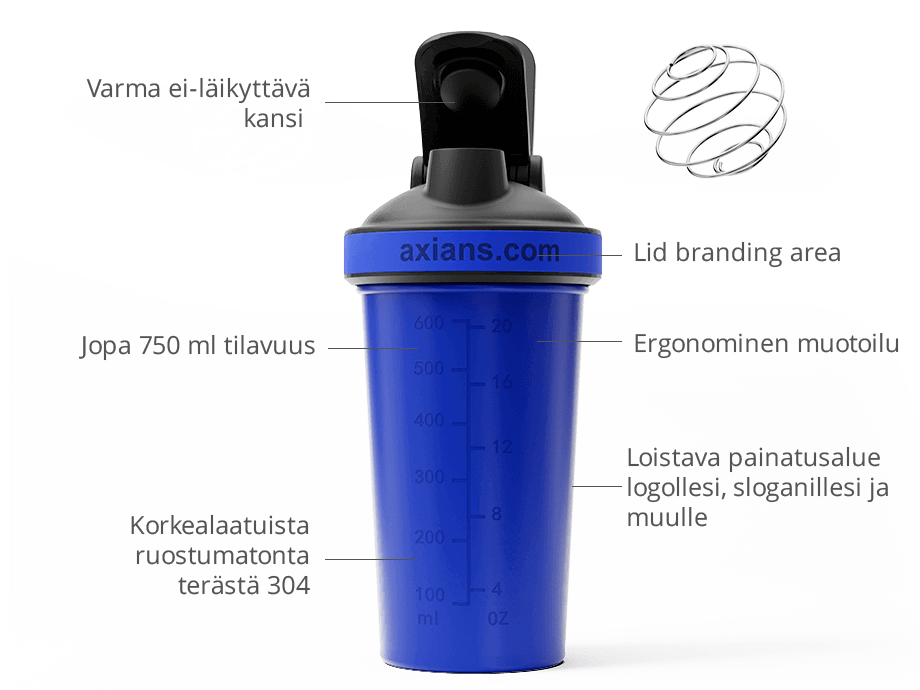 Fuel-proteiinishaker-pullomme on täysin räätälöitävissä oleva vesipullo, jossa on useita brändäysvaihtoehtoja. Voit myös valita eri värejä kannen reunukseen ja pullon runkoon, mikä luo entistäkin huomiota herättävämmän muotoilun.