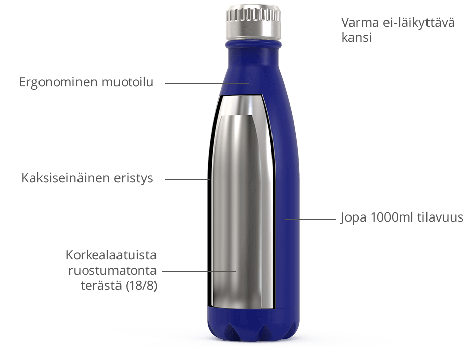 Kaksiseinäinen rakenne on valmistettu korkealaatuisesta ruostumattomasta teräksestä, jossa on tyhjiöeristys, joka pitää juomat kuumina 12 tuntia tai kylmät juomat kylminä 48 tuntia.