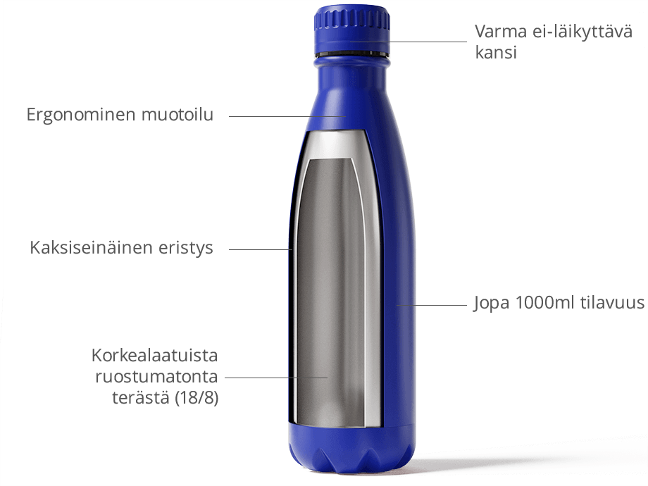 Elintarvikelaatuinen kaksoisseinämäinen rakenne on valmistettu tyhjiöeristyksellä, joka pitää juomat kuumina 12 tuntia tai kylmät juomat kylminä 48 tuntia.