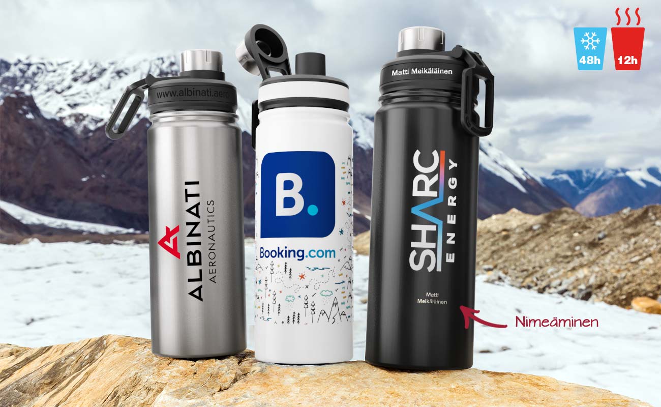 Voimme brändätä juomatarvikkeesi upealla grafiikalla, koko tuotteen ympärille. Lopputulos on erittäin eloisa ja silmiinpistävä promotuote joka säilyy käytössä päivittäin, antaen brändillesi laajan näkyvyyden.