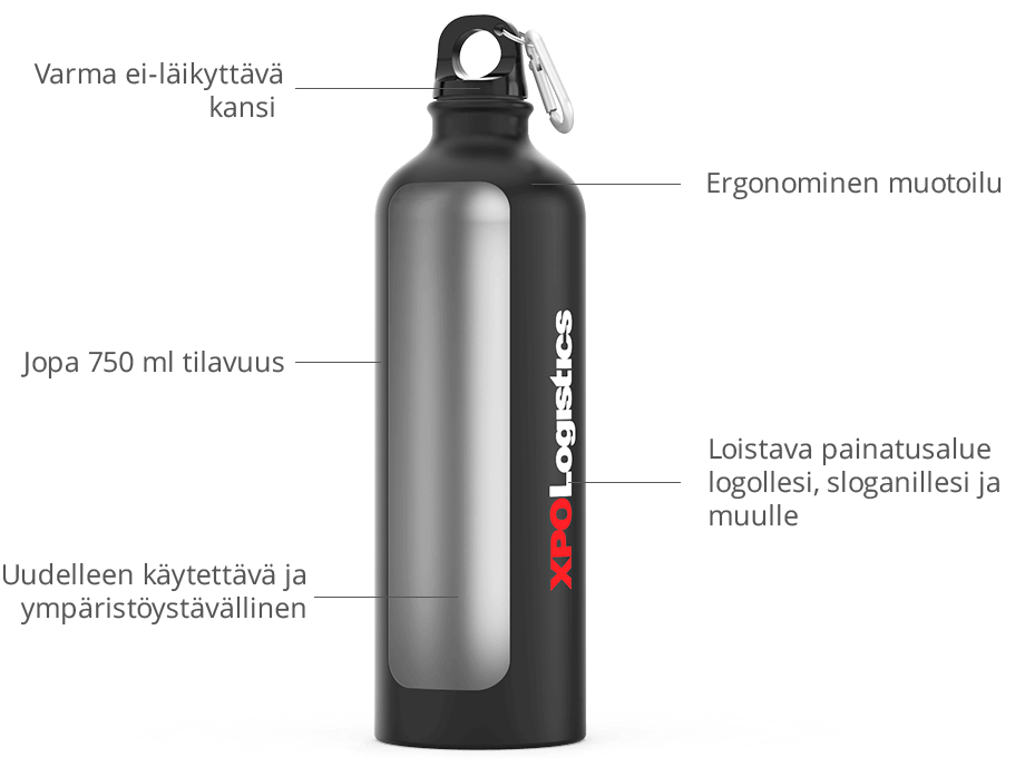Voimme brändätä juomatarvikkeesi upealla grafiikalla, koko tuotteen ympärille. Lopputulos on erittäin eloisa ja silmiinpistävä promotuote joka säilyy käytössä päivittäin, antaen brändillesi laajan näkyvyyden.